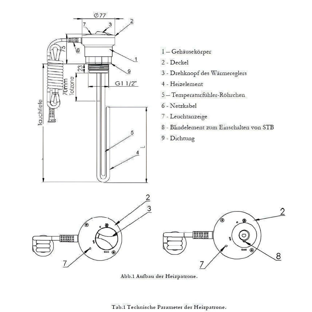 El elemento calefactor tiene una potencia de 1 1/2" El elemento calefactor tiene una rosca exterior (AG) y es compatible con acumuladores estándar de agua caliente sanitaria y agua potable. Gracias a su longitud de instalación compacta de 300 mm y una longitud sin calefacción de 70 mm, el elemento calefactor se integra rápida y fácilmente. El cable de conexión de 1,5 metros incluido con enchufe Schuko garantiza una alimentación eléctrica sencilla y directa.