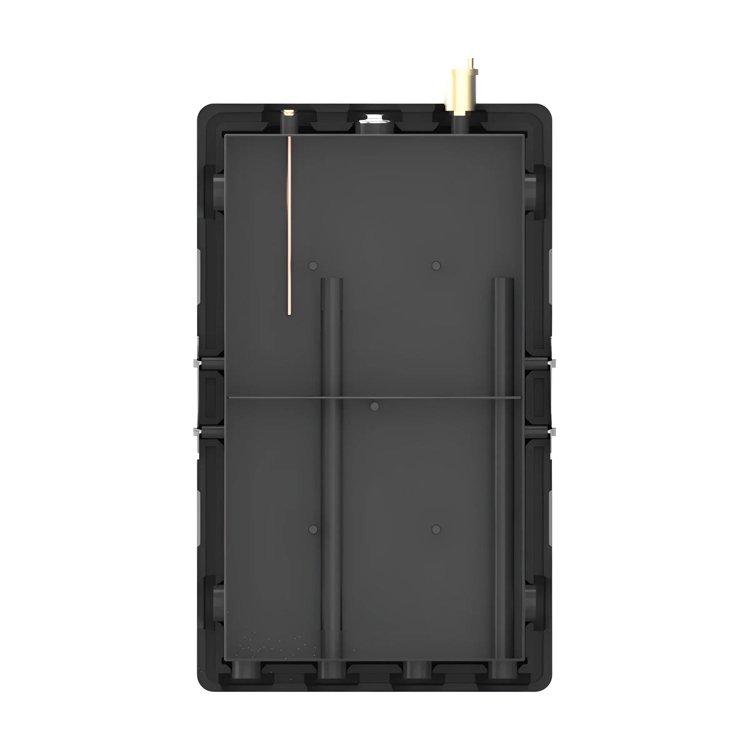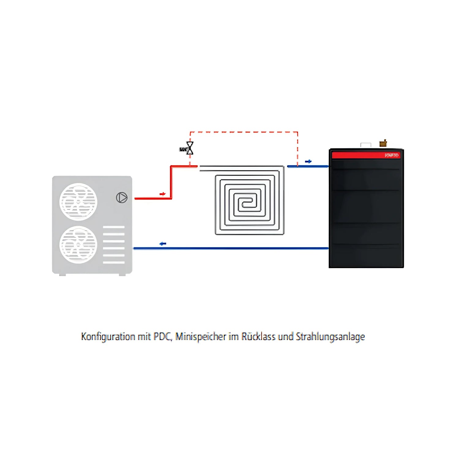Con unas dimensiones externas de 520 × 860 × 240 mm (An × Al × Pr) y un caudal máximo de hasta 4,5 m³/h, el tanque de almacenamiento destaca por su baja pérdida de presión y su conducción hidráulica optimizada. Una válvula de purga automática y un eje de sensor de temperatura vienen integrados de fábrica para minimizar el esfuerzo de instalación.