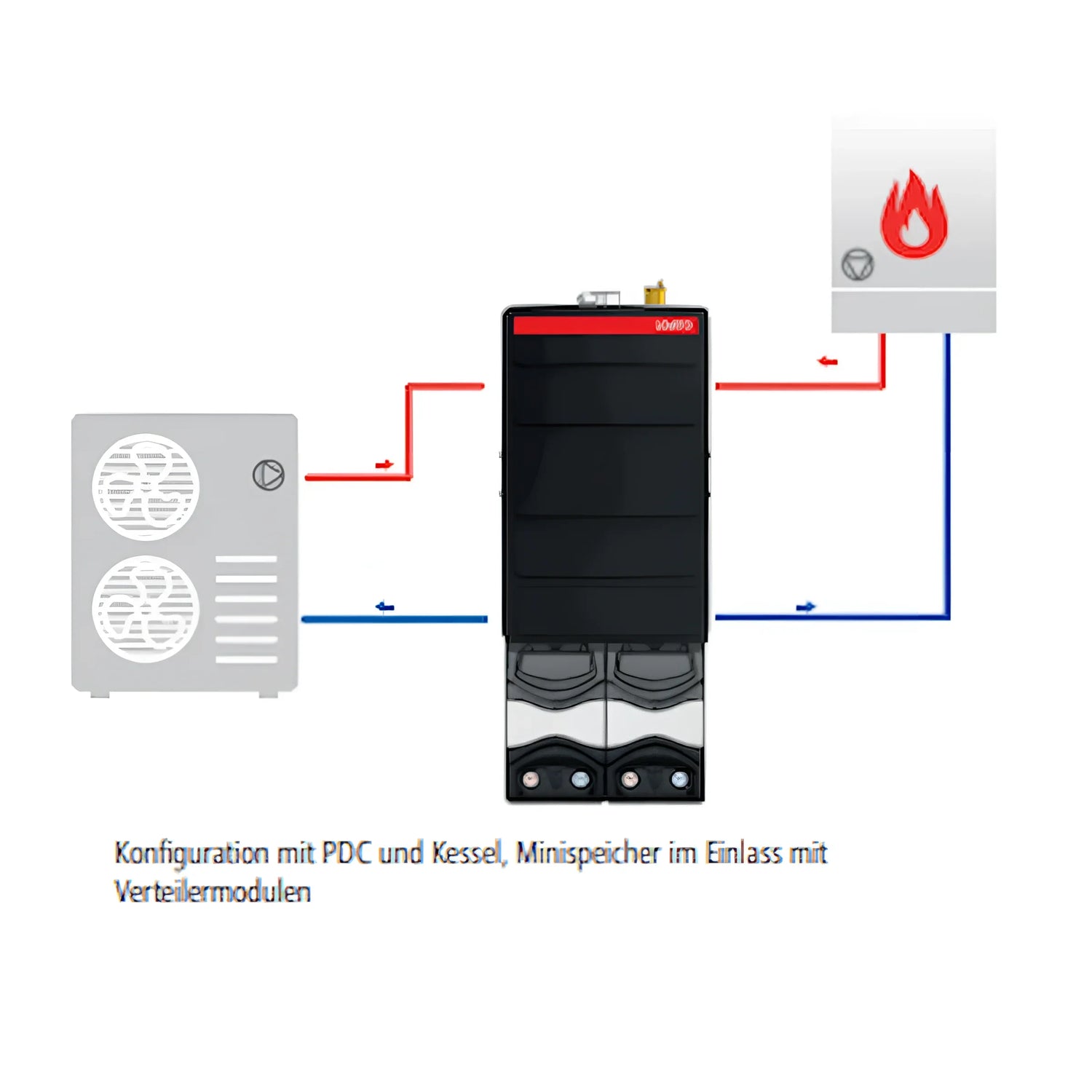 Equipado con una membrana interna y un separador hidráulico, el tanque de almacenamiento también funciona como distribuidor para hasta dos circuitos de calefacción o refrigeración. De esta manera, no solo garantiza una estratificación eficiente del fluido, sino que también coordina de forma fiable la distribución de los medios de calefacción o refrigeración.