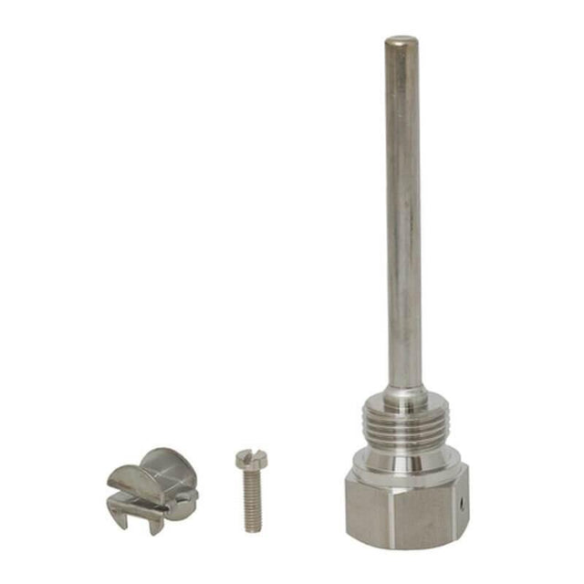 El manguito de inmersión tiene una longitud de 100 mm y un diámetro de 8 mm, con un espesor de material de 0,75 mm. Estas dimensiones óptimas permiten una colocación y medición precisas, esenciales para el correcto funcionamiento del termostato de gases de combustión.