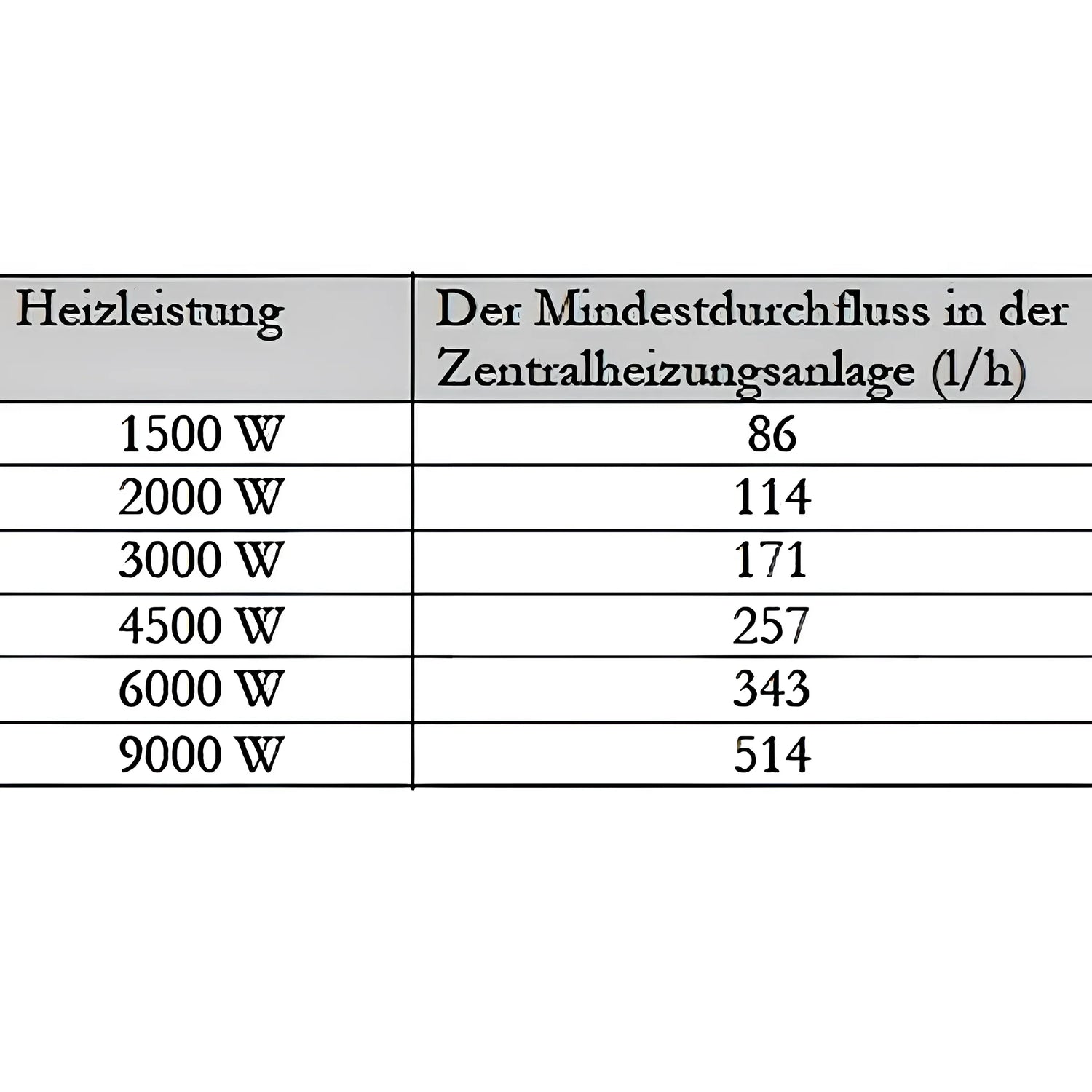 Protočni bojler za centralno grijanje ima precizne mogućnosti spajanja: Priključak polaza i povrata mjeri 1 1/4" IG, dok je priključak za grijaći element postavljen na 1 1/2" IG. Dostiže maksimalnu dopuštenu radnu temperaturu od 90 °C i sigurno radi do radnog tlaka od 10 bara.