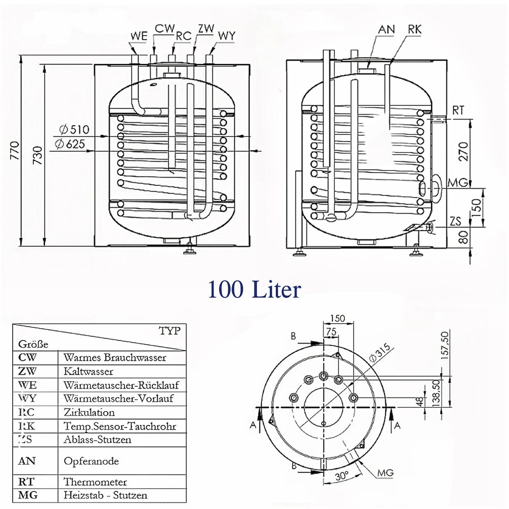 Volumen: 100 litara; Površina izmjenjivača topline: 1,2 m²; Kapacitet izmjenjivača topline: 5,27 litara. Priključci za dovod, povrat i cirkulaciju su svaki po 3/4" AG, dopunjen s 1 1/4" IG priključak za magnezijevu anodu i 1 1/2" IG priključak za električni grijaći element.