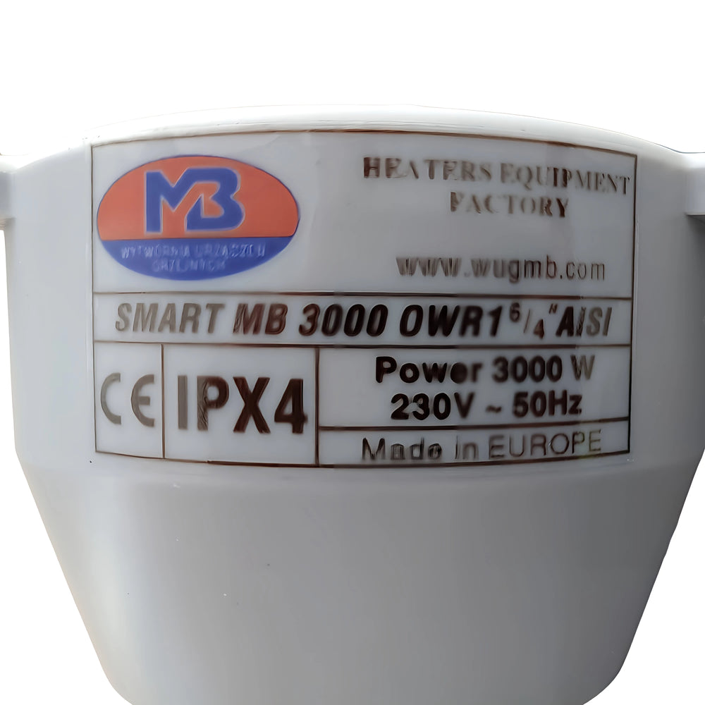 Galingumas 3,0 kW esant 230 V, montavimo ilgis 345 mm, saugos riba 85 °C ir valdiklis, kurį galima reguliuoti nuo maždaug 10 °C iki maždaug 75 °C. Įrenginys turi būti montuojamas horizontaliai, o jungiamieji sriegiai atitinka 1 1/2" AG, o tai palengvina integravimą į įprastas sandėliavimo ir šildymo sistemas.