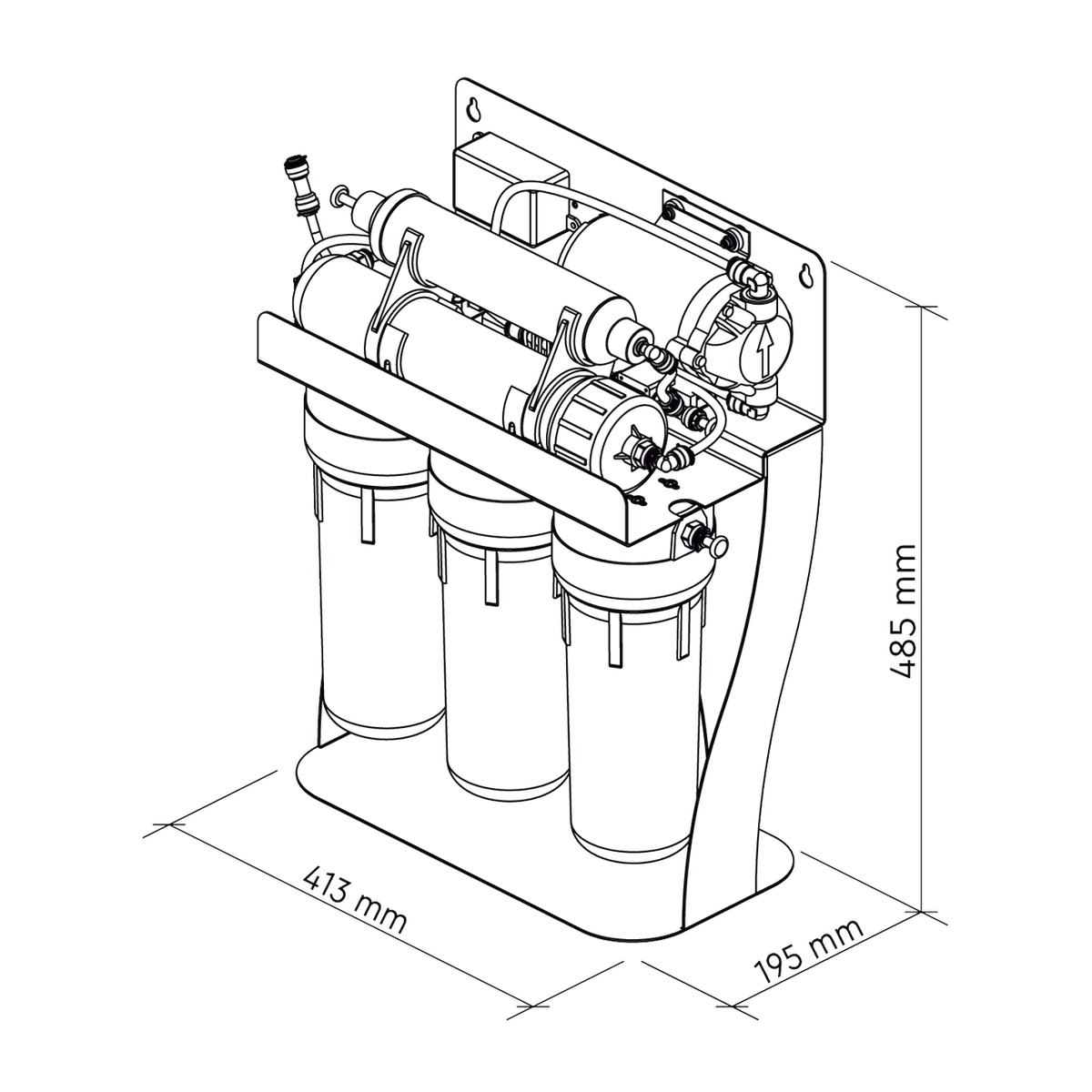 Wolnostojąca metalowa rama umożliwia szybki i łatwy montaż pod zlewem lub w innych pomieszczeniach gospodarczych. Wszystkie przyłącza, zawory i adaptery są dołączone i można je zamontować bez użycia specjalistycznych narzędzi.