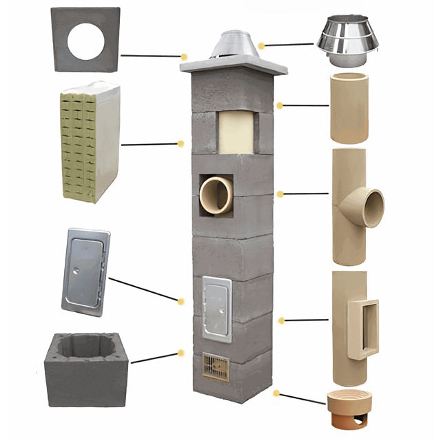 Spezielle Konstruktionselemente sorgen dafür, dass die einfache Montage problemlos sowohl im Innen- als auch im Außenbereich möglich ist. Das vergleichsweise geringe Gewicht der Präzisionselemente ermöglicht eine leichte Handhabung sowie einen schnellen und effizienten Aufbau. Zum System gehören robuste Mantelsteine, langlebige Keramikrohre und hochwertige Wärmedämmplatten. Diese Komponenten gewährleisten einen optimalen Betrieb moderner Feuerstätten mit niedrigen Abgastemperaturen und hohen Wirkungsgraden.