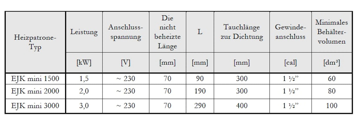 Elementul de încălzire are o conexiune cu 1 1/2" Are un filet exterior (AG) și se potrivește în rezervoarele standard de apă caldă menajeră și apă potabilă. Datorită lungimii sale compacte de instalare de 300 mm și a lungimii neîncălzite de 70 mm, cartușul de încălzire poate fi integrat rapid și ușor. Cablul de conectare de 1,5 metri inclus cu ștecher Schuko garantează o alimentare directă și simplă.