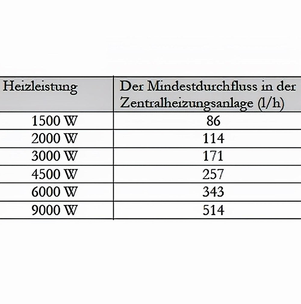 Najmanjši pretoki – 86 l/h za 1,5 kW, 114 l/h za 2,0 kW, 171 l/h za 3,0 kW, 257 l/h pri 4,5 kW, 343 l/h pri 6,0 kW in 514 l/h pri 9,0 kW – zagotavljajo učinkovit prenos toplote in nemoteno delovanje tudi pri različnih potrebah po toploti.