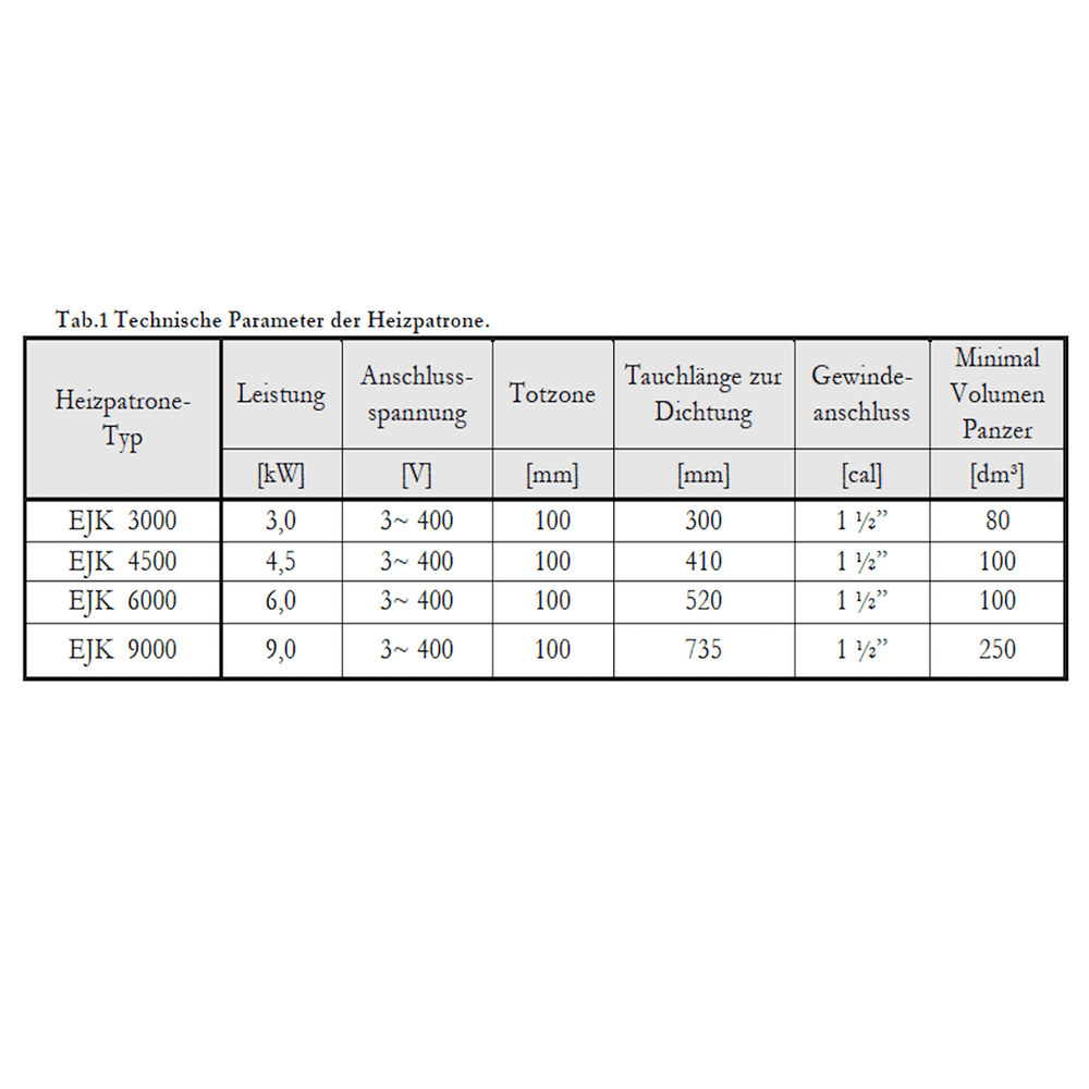 Värmepatronen i det kompletta paketet finns i olika effektklasser, speciellt utformade för 1,5 kW, 2,0 kW, 3,0 kW vid 230 V och 4,5 kW, 6,0 kW och 9,0 kW vid 400 V. Dessa varianter möjliggör optimal anpassning till värmesystemets individuella energibehov.
