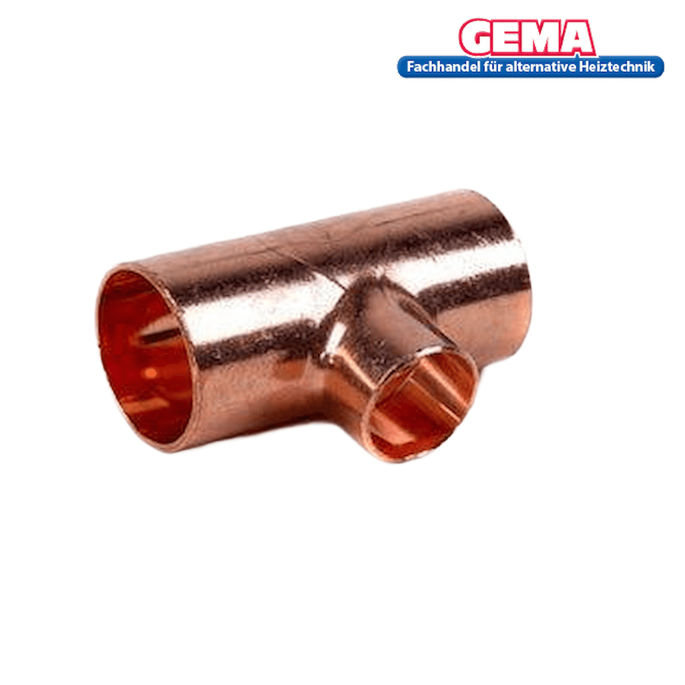 Lödkoppling T-stycke med två muffar och en reducerad muff för kopparrör.