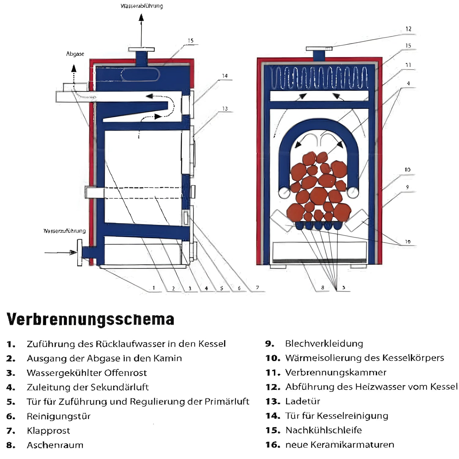 Energi genereras genom en tvåstegsprocess: Först förgasas de använda bränslena under kontrollerade förhållanden. Detta följs av fullständig och ren konventionell förbränning. Kombinationen av dessa två processer säkerställer en särskilt effektiv bränsleanvändning. Primär- och sekundärlufttillförseln styrs enkelt manuellt, vilket bidrar till optimal förbränning och långa brinntider.